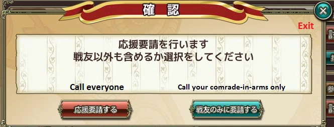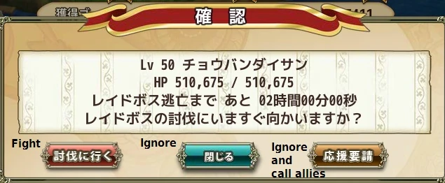 - 応援要請 / Call for reinforcements: This button allows you to call one of either random players or just your friends to help defeat the raid boss. This option only appears for raid bosses you have personally found.