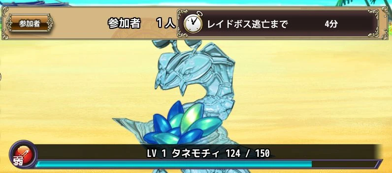 The most common RB. You'll see it a lot when people run Event maps during non-RB events. It's easy to kill it with one raid point. The low level ones drop equipment gacha seeds instead of mid-level ones, so they should be ignored. Its name comes from 種欲しい. |