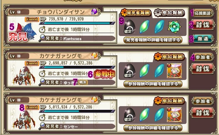 - 参加者 / Participants: This buttons lets you see a list of all people who fought the raid boss. The player who found the raid boss is included even if s/he did not deal any damage to the raid boss.