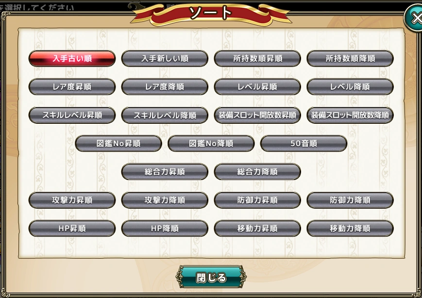 This page documents the various sort and filter options in the game. On this page, Asc. is short for ascending, and Desc. is short for descending. The 50 Sounds Order can be thought of as the Japanese version of alphabetical order.